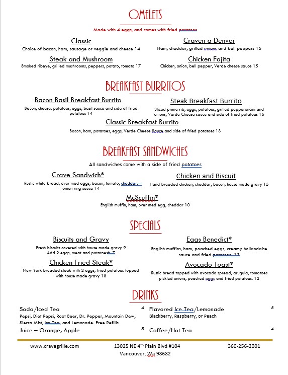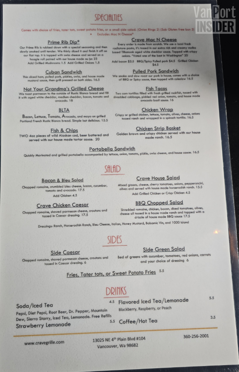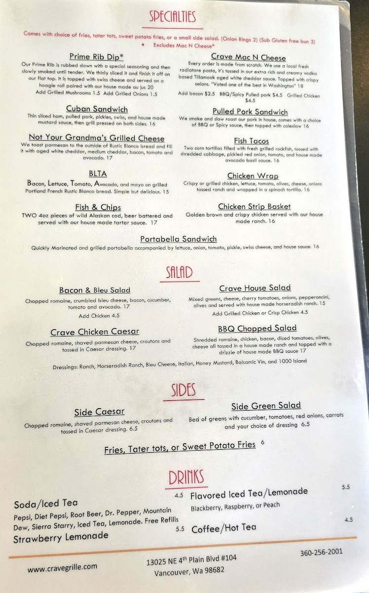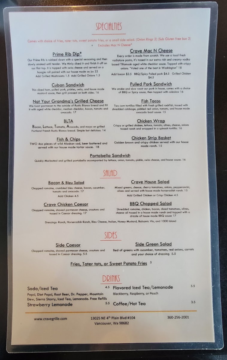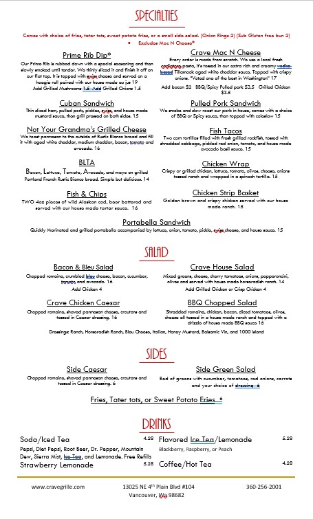 Welcome to Crave Grille, a delightful American restaurant located at 13025 NE Fourth Plain Blvd, Vancouver, WA. Known for its mouthwatering burger selection, Crave Grille offers the standout 1/2lb Wagu Burger, featuring Kobe-style beef, melted cheddar, and house sauce—paired perfectly with your choice of sides at just $15.98. For cheese lovers, the Bleus Burger adds a rich layer of crumbled bleu cheese, avocado, and a savory sauce for $17.48.